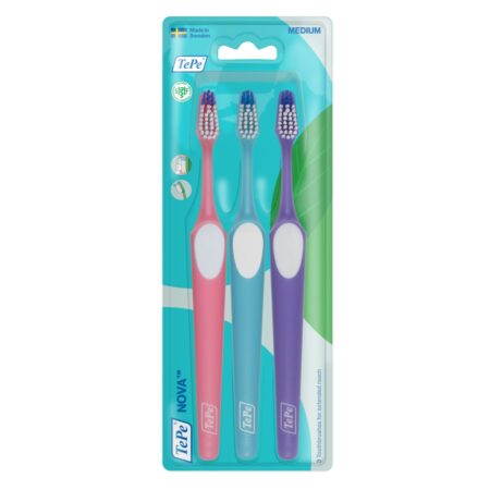 - O periuta TePe Supreme Compact cu perii de doua dimensiuni pentru un acces imbunatatit in jurul bracketi-lor si sub fire